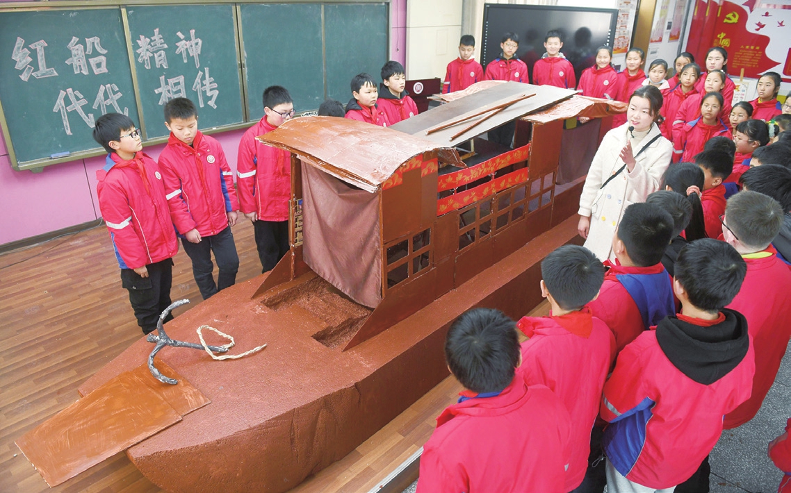 连日来,颍东区东平路小学组织10多名老师在课余时间,利用废旧纸箱、木板和泡沫等材料,制作了一艘长6米、宽1.2米、高1.45米的嘉兴南湖红船模型,放进校园展厅内,让学生不出校园近距离参观红船,以更好了解党史,传承红色基因。