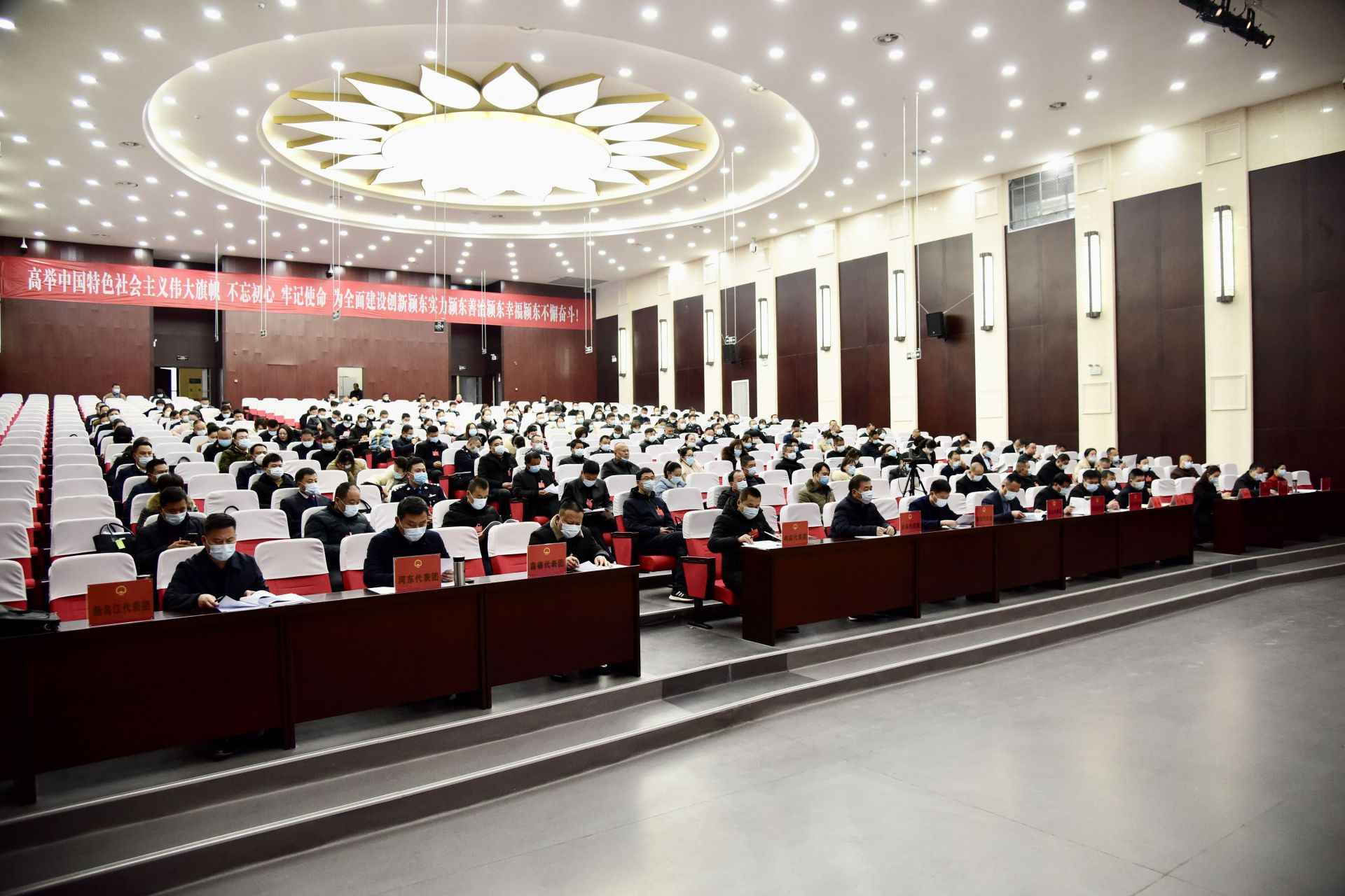 会场气氛庄严而热烈。后方悬挂着“高举中国特色社会主义伟大旗帜,不忘初心,牢记使命,为全面建设创新颍东、实力颍东、善治颍东、幸福颍东不懈奋斗!”的巨幅标语,鼓舞人心,催人奋进。
