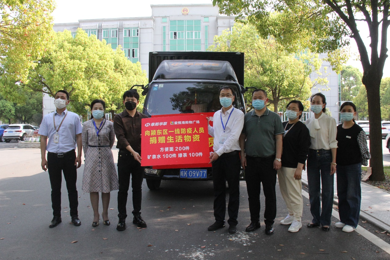 4月11日,阜阳华联爱情海购物广场向颍东区一线防疫人员捐赠200箱方便面、100件矿泉水、100件绿茶饮品等物资。