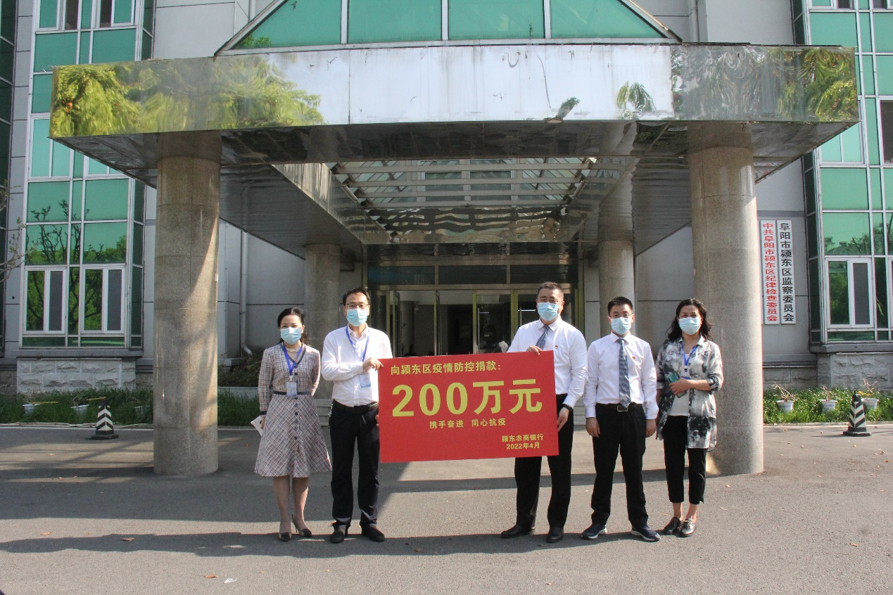 4月11日,颍东农商银行向颍东区捐款200万元,助力疫情防控。