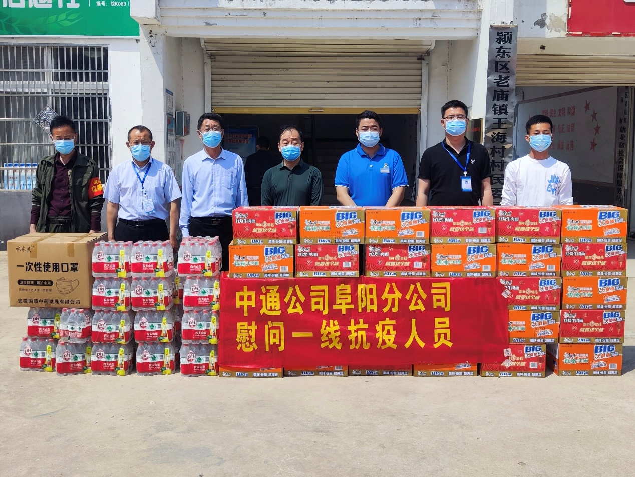 4月11日,中通公司阜阳分公司向颍东区老庙镇王海村捐赠方便面、矿泉水、口罩等物资,支援一线抗疫人员。