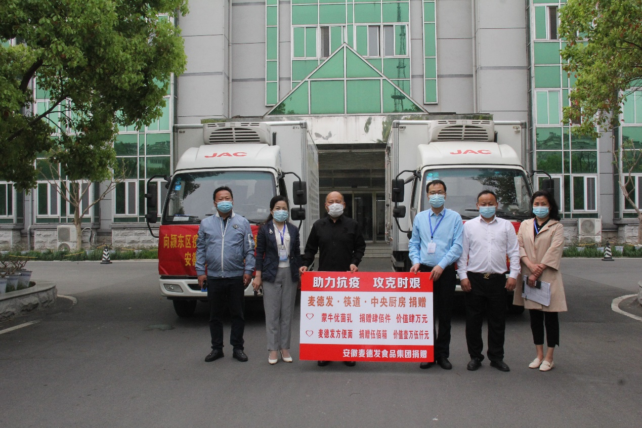 4月12日,安徽麦德发食品集团向颍东区疫情防控指挥部捐赠400件酸奶和500箱方便面,价值5.5万元。