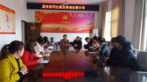 2月13日上午,新华街道共青团召开座谈会,分享优秀青年团干部温佳音同志青春故事。办事处、各村(社区)、中心校团委干部参会。 温佳音同志在会上分享了她自2013年踏上工作岗位以来的经历和心路历程。谈了对奋斗精神和青年干部担当精神的理解,也讲述了自己成长中的困惑与问题。随后,大家纷纷表示要向温佳音同志学习,珍惜自己的青春年华,珍惜时代赋予的宝贵机遇,珍惜现有的工作岗位,胸怀梦想,脚踏实地,不怕挫折,多汲取健康成长的正能量,不懈努力、奋进前行,为颍东发展贡献智慧和力量,早日实现自己的梦想。 温佳音同志获得荣誉: 2013年 颍东区文明办“青年岗位能手” 2014年颍东区妇联 “关爱留守儿童优秀志愿者” 2015年度颍东区委“三八红旗手” 2012-2016年度颍东区委颍东区“优秀共青团干部”