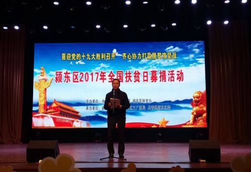 10月17日下午,由颍东区委宣传部、区扶贫办主办,区工商联、区文广新局、共青团颍东区委承办的颍东区“喜迎十九大 齐心协力打赢脱贫攻坚战”文艺演出暨全国扶贫日募捐活动在育新小学报告厅举行,区委副书记王显明致辞。