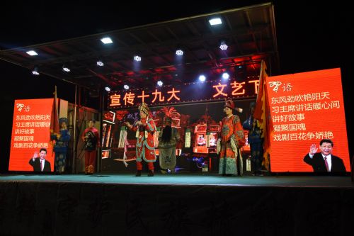 11月21日晚上,由阜阳市颍东区文化广电局主办的“宣传十九大 文艺下基层”颍东区“送戏曲进校园、进乡村、进社区”专场演出在幸福路安置区举行,紧扣十九大所精心创作的14个节目吸引了二百余名群众前来观看,将十九大精神通过艺术化宣讲植根在群众心中。