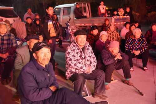 当日下午5时许,演出现场还在紧锣密鼓地筹备中,几位演出人员穿着单薄的戏服,在幕后抓紧时间揣摩台词。不少附近的村民拿着板凳在演出场地前默默等待,有的老人吃完晚饭后带着孙儿匆匆来到现场。为了“站得高看得远”,有的村民把农用车也当成了看台。演出现场里里外外围了好几层,现场热闹非凡,却又井然有序。