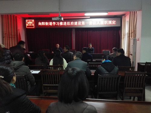 11月30日上午,向阳街道组织专题学习会,集体学习中共中央办公厅、国务院办公厅印发的《党政主要负责人履行推进法治建设第一责任人职责规定》。会议由街道党工委副书记、办事处主任于飞主持,街道全体机关工作人员参加了学习。