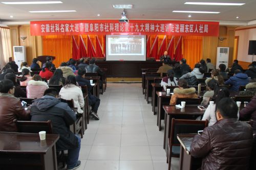 12月11日,党的十九大精神安徽社科名家大巡讲暨党的十九大精神阜阳市社科理论家大巡讲走进颍东区人社局,安徽省社科名家、省委百人理论宣讲团成员、市委讲师团团长燕少红作党的十九大精神宣讲报告。区委组织部副部长、区人社局党组书记、局长刘仿杰主持报告会。