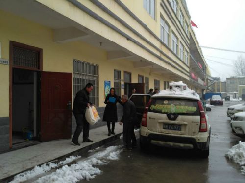 1月7日,在寒风中,正午镇政府的工作人员正在将雪灾救灾生活物资发放装车。