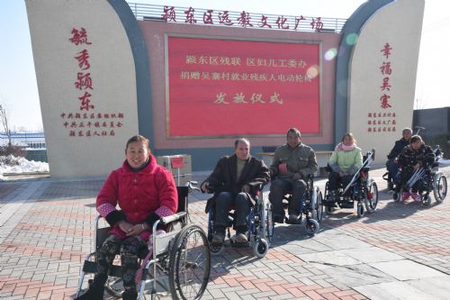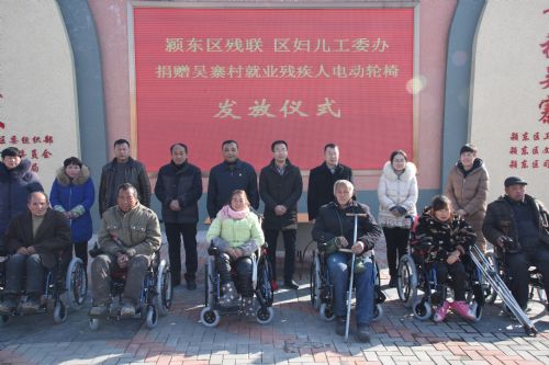 1月10日,颍东区捐赠贫困就业残疾人电动轮椅启动仪式在正午镇吴寨村举行。当天在吴寨村扶贫工厂就业的7名贫困残疾人高兴地领到了电动轮椅。