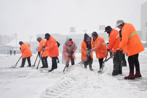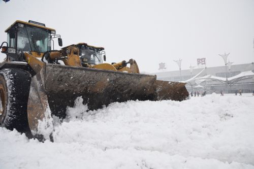 颍东区积极响应市委市政府的部署,积极防范应对冰雪低温天气,迅速行动起来,组织铲车铲雪,人工除雪,全力以赴保障交通顺畅,人员集中场所出行安全。图为,火车场广场动用两辆铲车并排铲雪作业,安排环卫工人清出安全通道,为旅客来往出行提供方便。