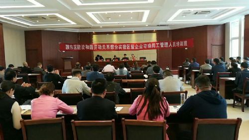 3月30日,颍东区总工会联合区人社局在颍东开发区徽清科技园举办了颍东区建设和谐劳动关系综合试验区暨企业劳动用工管理人员培训班。颍东区开发区管委会副主任张志刚、区总工会副主席刘莎莎、区人社局副局长朱洪玉参加了培训会议并讲话。来自园区及12个乡镇办事处的近百名企业的工会主席和人力资源管理人员参加了培训。