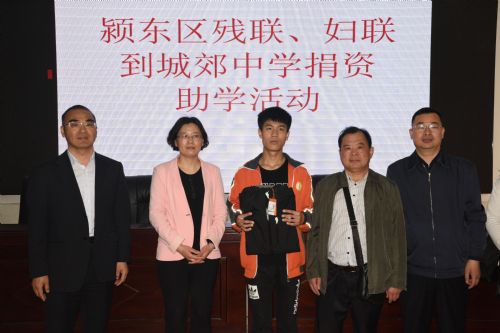 4月11日,颍东区残联与妇联联合开展捐资助学活动。颍东区残联理事长韦永华、妇联主席杨丽参加活动。