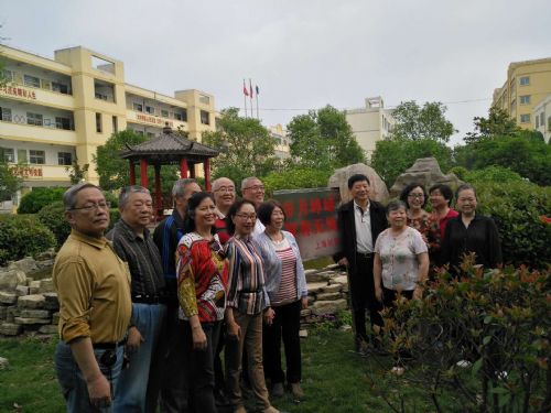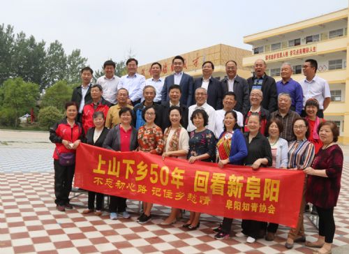 车子来到新乌江地界,老知青们不停地向远处张望,寻找自己插队的村庄,但是当年熟悉的标识不复存在,自己无法找到了。很快到了新乌江镇中心学校,这是老知青此行的第二个目的地。他们一直情系王古同,关心这里的发展,更加关注孩子们的成长成才,几年前,为新乌江镇中心学校捐资建了一幢综合楼,当地人亲切地叫它“知青楼”。墙体铜牌上镌刻着他们每个人的名字,铭记着他们的功德。他们来到“知青楼”、教学楼前合影留念,拉起了“上山下乡50年,回看阜阳新变化”“不忘初心路,记住乡愁情”的红条幅,突出了他们此行的主旨。
