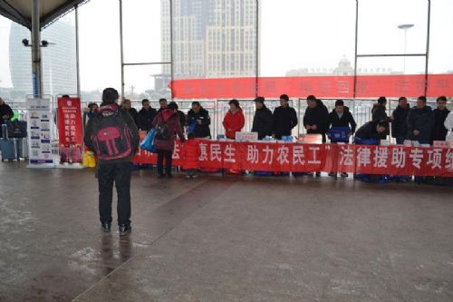 活动开展前,颍东区法律援助中心工作人员在火车站出站口醒目位置摆放桌椅,悬挂条幅,放置宣传资料,设置颍东区法律咨询点,力争做好春节前农民工返乡维权工作。