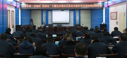 1月16日下午,全省首期“举旗帜送理论”专题宣讲报告会赴颍东区税务局新时代文明实践站开展专题宣讲活动。省委讲师团首期“举旗帜 送理论”宣讲团成员、颍泉区人社局办公室主任闫泷分受邀进行宣讲。颍东区税务局全体机关干部共90余人聆听了本次报告。