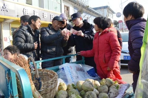 1月23日,阜阳市公安局颍东分局冉庙派出所利用赶集日组织民警走上集市开展“识假币、防假币”宣传活动。民警以真假币作为样本,从水印、手摸凹凸感等方面进行对比,向赶年集、买年货的群众介绍辨别真假人民币的几种方法,以提高群众的假币鉴别能力。同时,民警还就骗子使用假币的作案方法、手段进行了现场演示,使群众进一步掌握了防骗常识。