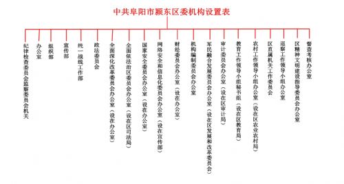 颍东区委设置纪检监察机关1个,计入机构限额的工作机关10个(设在相关部门的区委议事协调机构的办事机构不计入机构限额)。其中,纪律检查委员会与监察委员会合署办公,实行一套工作机构、两个机关名称;办公室挂政策研究室、保密委员会办公室(区国家保密局)、区档案局牌子;组织部挂老干部局、非公有制经济和社会组织工作委员会、区公务员局牌子;宣传部挂区政府新闻办公室牌子;统一战线工作部挂台湾工作办公室(区政府台湾事务办公室)、区民族宗教事务局、区政府侨务办公室牌子;区委督查考核办公室挂区政府督查考核办公室牌子;区委信访局与区政府信访局合署办公,不计入机构限额。