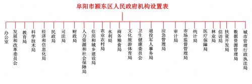 颍东区人民政府设置工作部门26个。其中,办公室挂区政府外事办公室牌子;财政局挂区政府国有资产监督管理委员会、地方金融监督管理局、区政府金融工作办公室牌子;文化旅游体育局挂广播电视新闻出版局牌子;市场监督管理局挂知识产权局牌子;数据资源管理局挂政务服务管理局牌子。