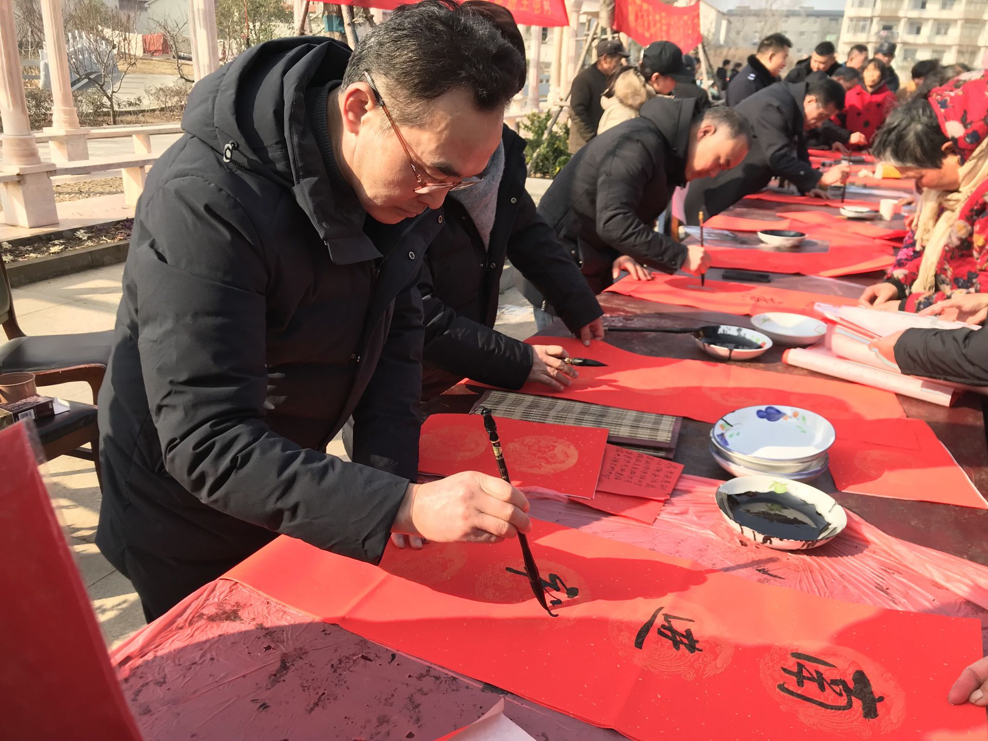 在活动现场,文体部门精心编排了内容丰富、形式多样、群众喜闻乐见的文艺节目,节目内容积极向上,充分反映了社会发展的新变化和新成就;农业农村局、科技、科协等部门将宣传党的十九大精神同为农民科技服务、政策服务相结合,现场向发放科普、种植养殖等相关宣传资料,向村民介绍小麦、果木的良种培育、种植技术和农药使用等问题;卫健部门组织卫生服务人员为群众免费体检、诊疗;司法部门组织法律工作者通过咨询等方式现场解答群众普遍关心的民生问题,为群众提供政策法律服务;来自区文联的书法爱好者们则泼墨挥毫,为父老乡亲免费书写春联,前来求取手写春联的乡亲们络绎不绝、供不应求。