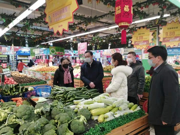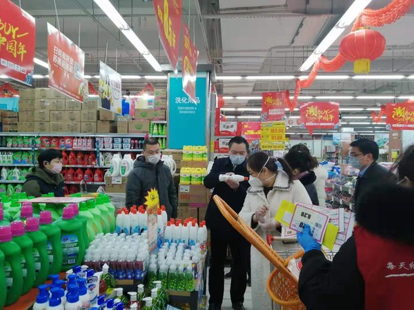 张银军一行先后深入华润苏果超市、新华城农贸市场等地,了解口罩、消毒液等防疫物资,生鲜蔬果、粮油肉蛋等生活用品市场供应、调配、价格情况,对防疫工作进行现场指导。