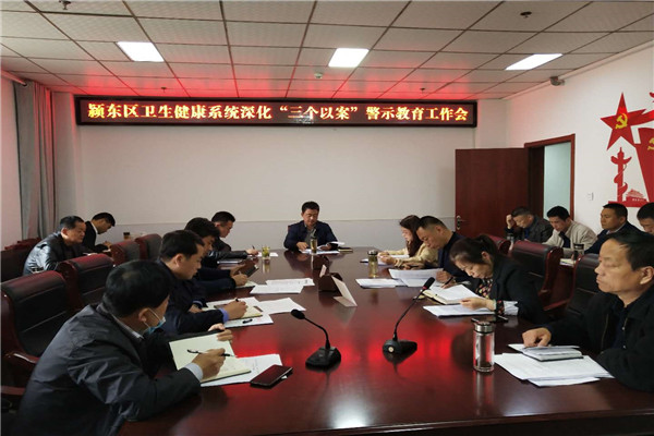4月23日下午,颍东区卫生健康系统召开深化“三个以案”警示教育工作会议。卫健委党组、党委书记、主任任卫锋主持会议并讲话,卫健委党组成员、党委委员、纪委委员、委机关科级干部、各二级机构及各医疗机构主要负责同志参加了会议。