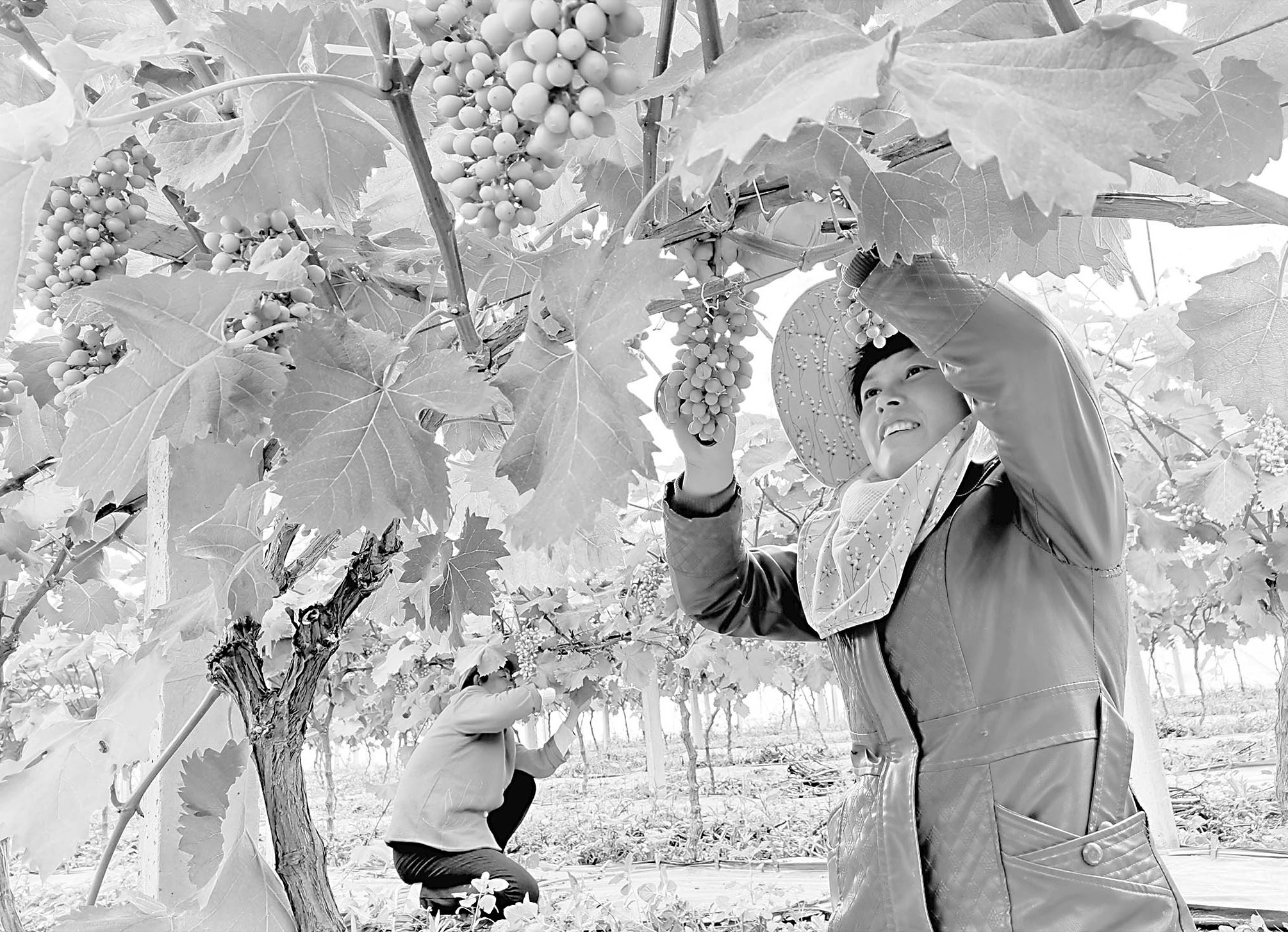 颍东区杭伟种植专业合作社通过“基地+农户+培训班”的农技传授模式,采取边学习边实践园艺技术的教学方式,先后为120多名贫困户提供果树种植技术培训。图为经过培训后,掌握一技之长的学员在合作社给葡萄树修果。