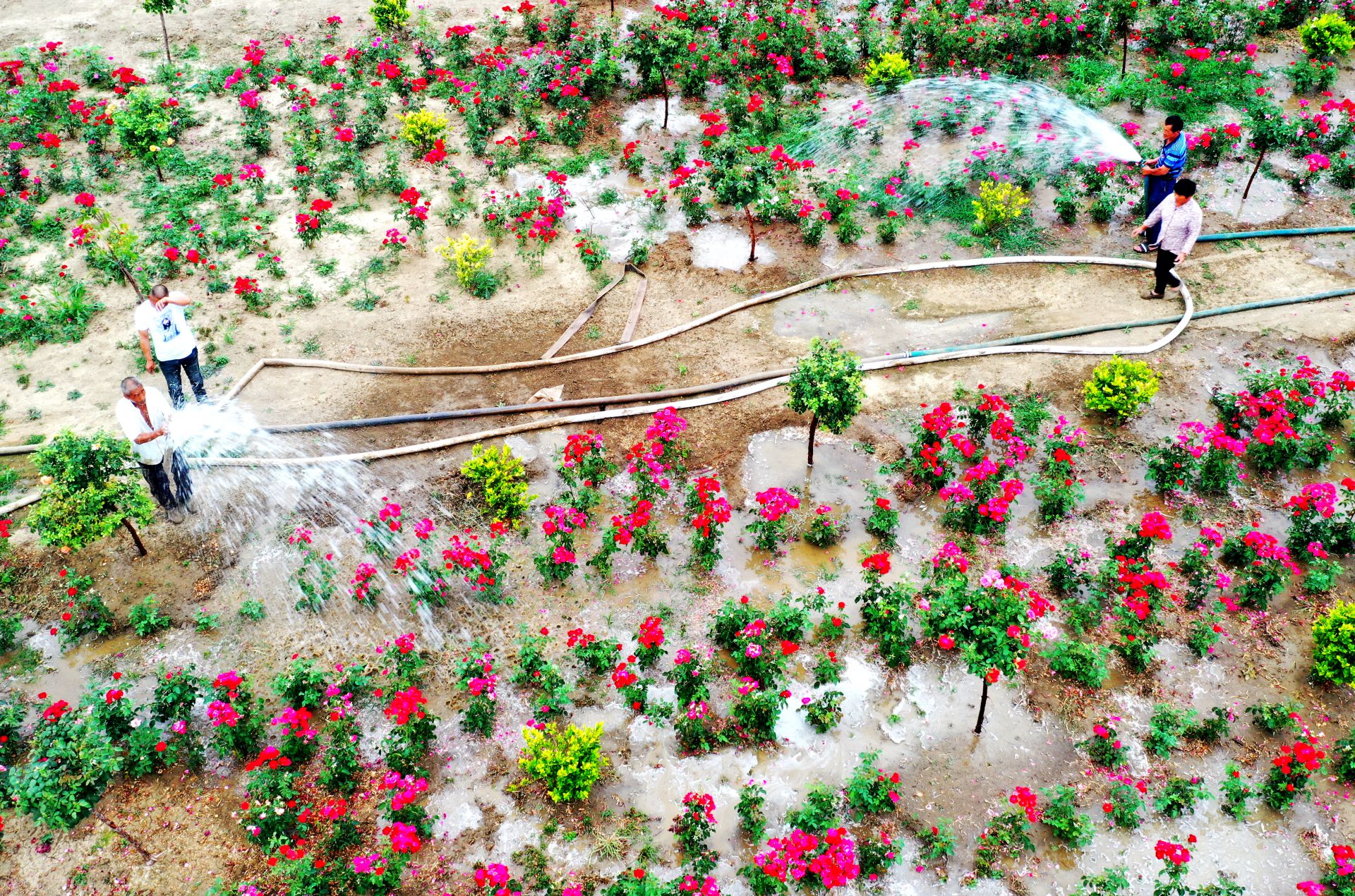 近日,颍东区明佳花木有限公司月季种植基地,工人们正忙着浇水。该公司位于老庙镇庙南村,主要发展生态观光农业,日前基地300亩月季竞相开放,吸引了众多游客前往赏花观景。特约摄影 卜光辉