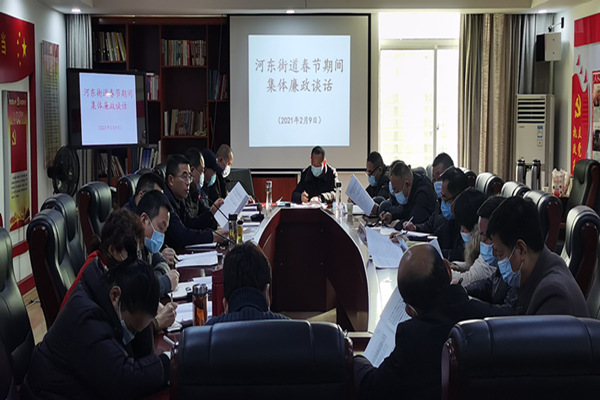 2月9日下午,河东街道开展集体廉政谈话,全体党政班子成员、各社区书记和机关站所负责同志参加谈话。