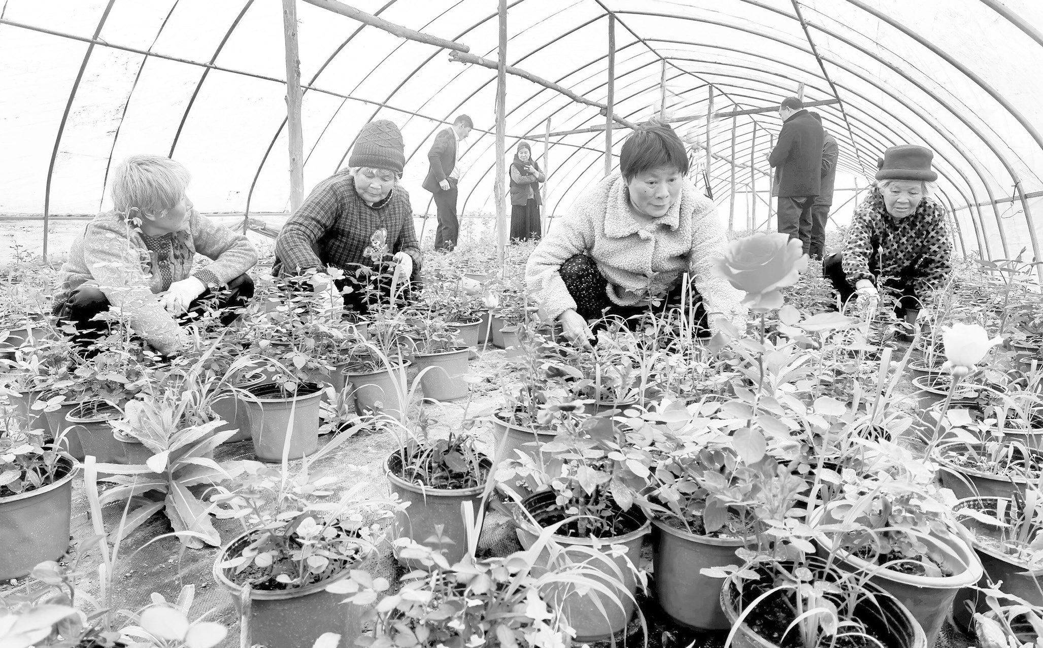 月季花成为市花后,全市月季花产业不断壮大。在颍东区正午镇洁然花卉基地,盆栽大棚月季花有20多个品种,长势喜人,年均销售4万多盆,实现了生态效益、社会效益、经济效益的共赢。图为洁然花卉基地,花农在给月季花浇水、除草。 本报通讯员 戚武奇 丁治见 摄