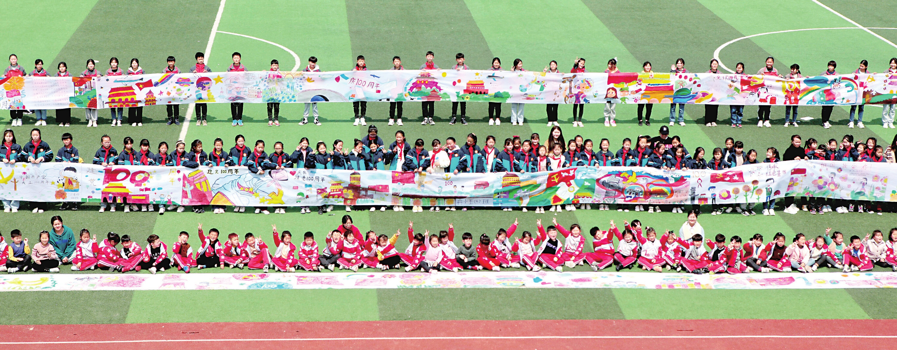 4月8日,颍东区冉庙乡中心学校开展“手绘百米长卷画说党史忆党恩”活动,400多名幼儿园、小学、中学学生代表,在老师的带领下,于百米长卷上,绘画党史故事、追寻红色记忆,表达对党的美好祝福。 特约摄影 吴世杰 通讯员 李晓梅 摄