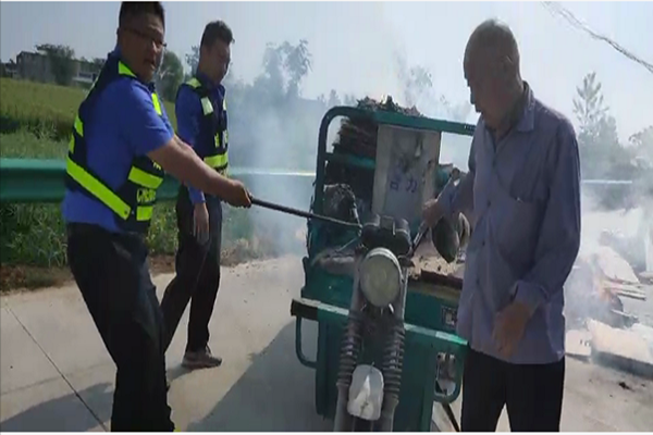 5月10日早晨,颍东城管局新华中队队员们像往常一样在巡查,巡至G35国道刘营村附近时,远远看到两位老年人驾驶一辆电动三轮车,行驶途中车厢载运的纸盒冒出黑烟,火苗上窜,情况十分危急。