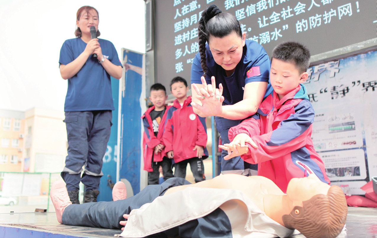 夏日来临,为进一步加强校园安全教育,提升学生防溺水安全意识,5月7日,阜阳市中青应急服务队志愿者来到颍东区插花镇闸南小学,向该校1300余名学生传授防溺水和安全自救常识。图为小学生在志愿者的指导下学习心肺复苏术。 特约摄影 吴世杰 通讯员 张文亮 摄