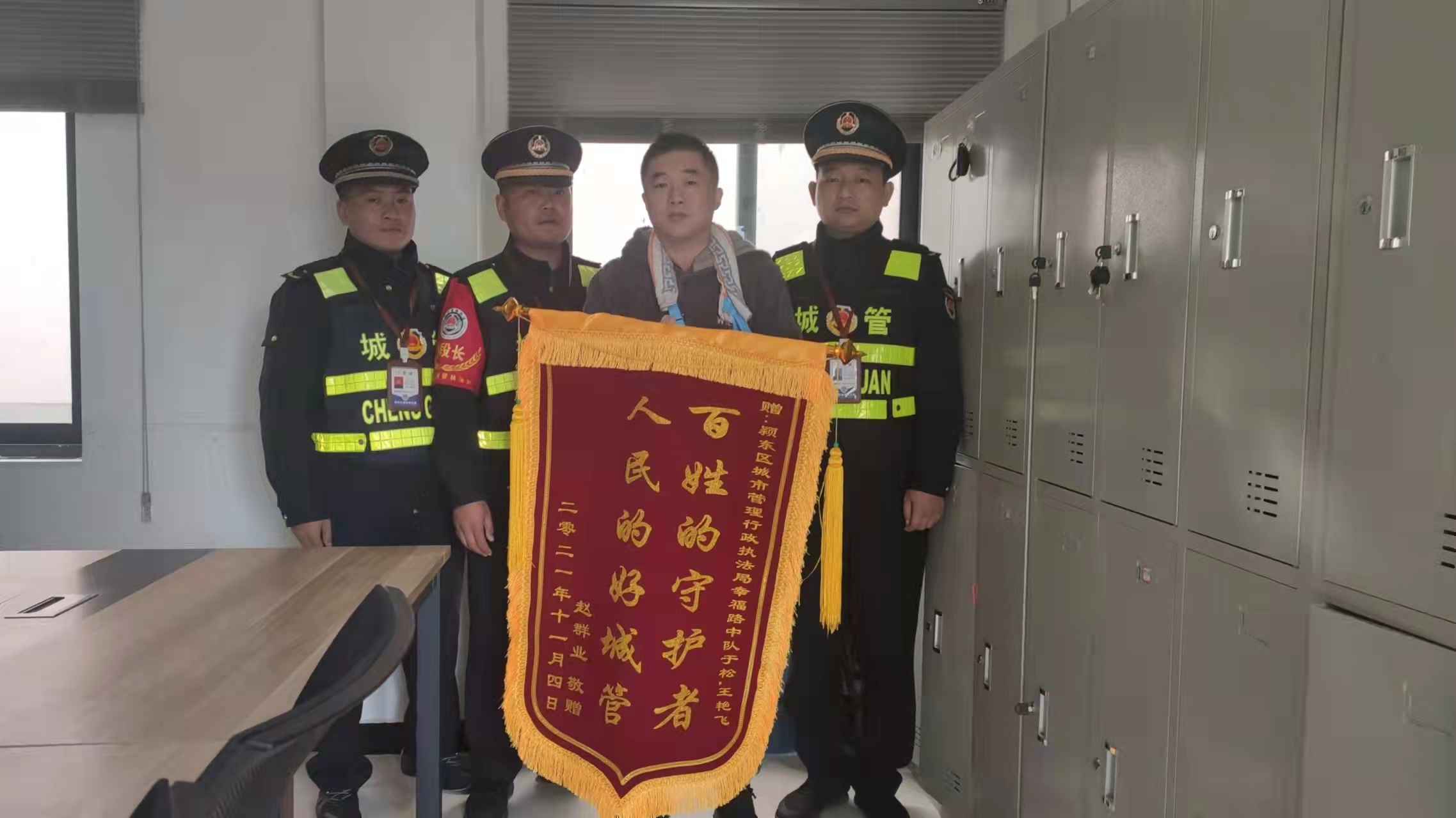 11月25日上午,阜阳市民赵先生将一面写有“人民的好城管,百姓的守护者”的锦旗送到阜阳市颍东区城市管理行政执法局向阳中队于松、王艳飞两位执法队员手上。