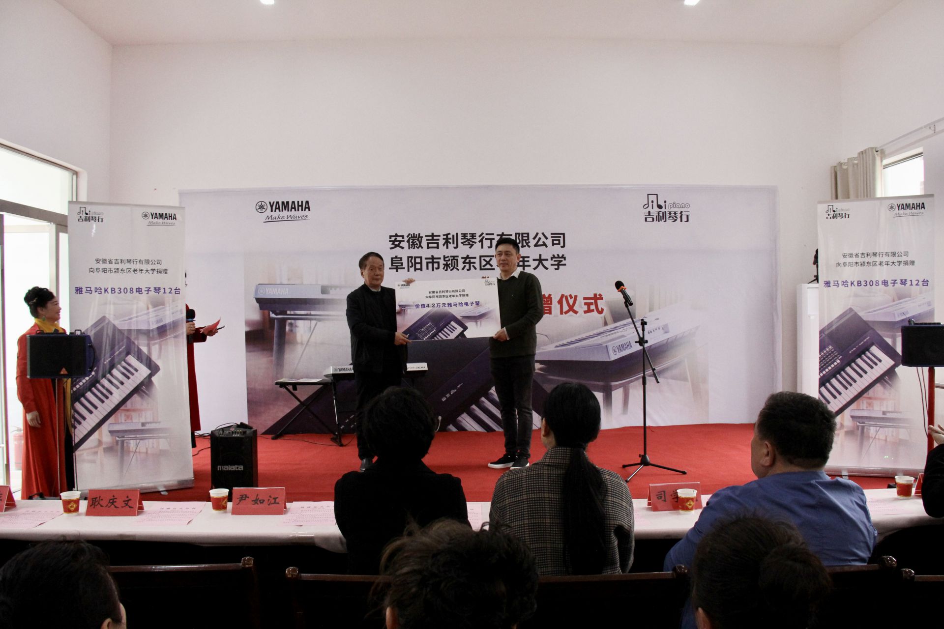 捐赠仪式上,颍东区老年大学校长尹如江对爱心企业的善举表示衷心感谢,雅马哈中国投资有限公司华东区代表杨睿,安徽省吉利琴行有限公司董事长、中央音乐学院考级安徽省考区副主任王欣,阜阳市妇女儿童发展基金会理事长司学龙分别进行了发言,现场捐赠了电子琴牌匾。
