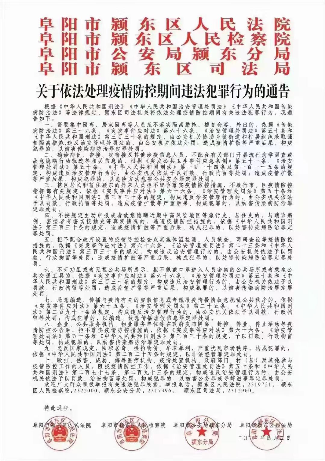 关于依法处理疫情防控期间违法犯罪行为的通告
