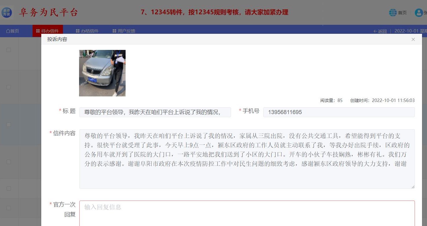 9月30日上午,阜阳市颍东区市民武先生通过阜阳“两有三解”平台进行求助,因阜城三区疫情防控临时管控,武先生的家属将于10月1日从阜阳市第三人民医院出院,没有公共交通工具可以乘坐,这让武先生夫妻回家的路变得困难。