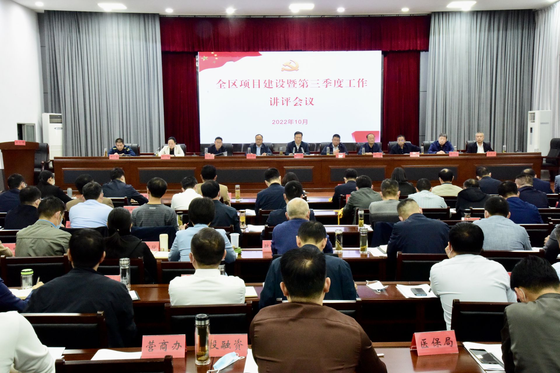 区四大班子成员,区直有关单位主要负责同志,12个乡镇街道党政主要负责同志参加会议。会议设置了首位席和末位席,为先进单位、后进单位授红旗和黄旗,通报了第三季度固定资产投资及项目建设、招商引资、优化营商环境、信访维稳等情况;住保中心、冉庙乡、化工新材料产业链牵头单位、税务局作交流发言,塌陷办、新华街道、现代服务业产业链牵头单位、发改委作表态发言。