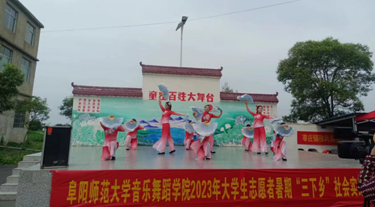 阜阳师范大学音乐舞蹈学院2023年大学生志愿者暑期“三下乡”社会实践服务队还以政策宣讲、现场互动等方式结合演出活动普及发电诈、防火防溺水知识,助力安全生产和红管家工作,为留守老人和儿童送温情,关爱退役军人和现役军人家庭,真正让“文化惠民工程”成为群众满意的“暖心工程”。