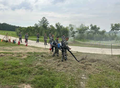 随着现场总指挥“开始”一声令下,七名身穿迷彩服的专业消防人员,迅速集结应急队伍力量并展开灭火行动,队员在判断风向后通过使用灭火器、灭火风机、灭火扫把等工具安全、快速、有序地控制了火情和余火清理等后续工作。