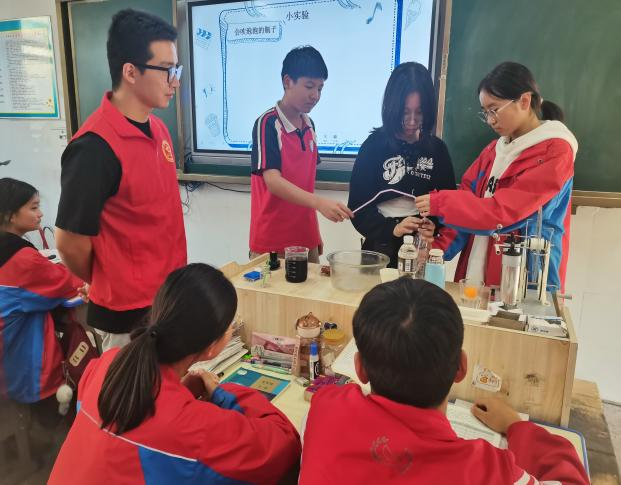 活动中,志愿者以平时的生活中用到的普通物品作为实验工具,同学们积极参与,踊跃回答问题,在观摩中了解实验中的科学原理,志愿者们和同学们互动频频,现场气氛热烈而活跃。